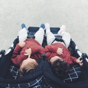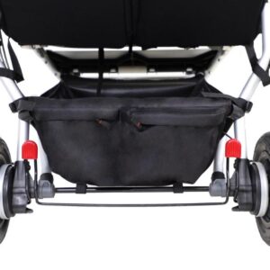 Wózek Duet zawiera: dwa siedzenia spacerowe z budkami, ramę wózka z koszem i uchwytem na butelkę oraz odpinany pałąk.